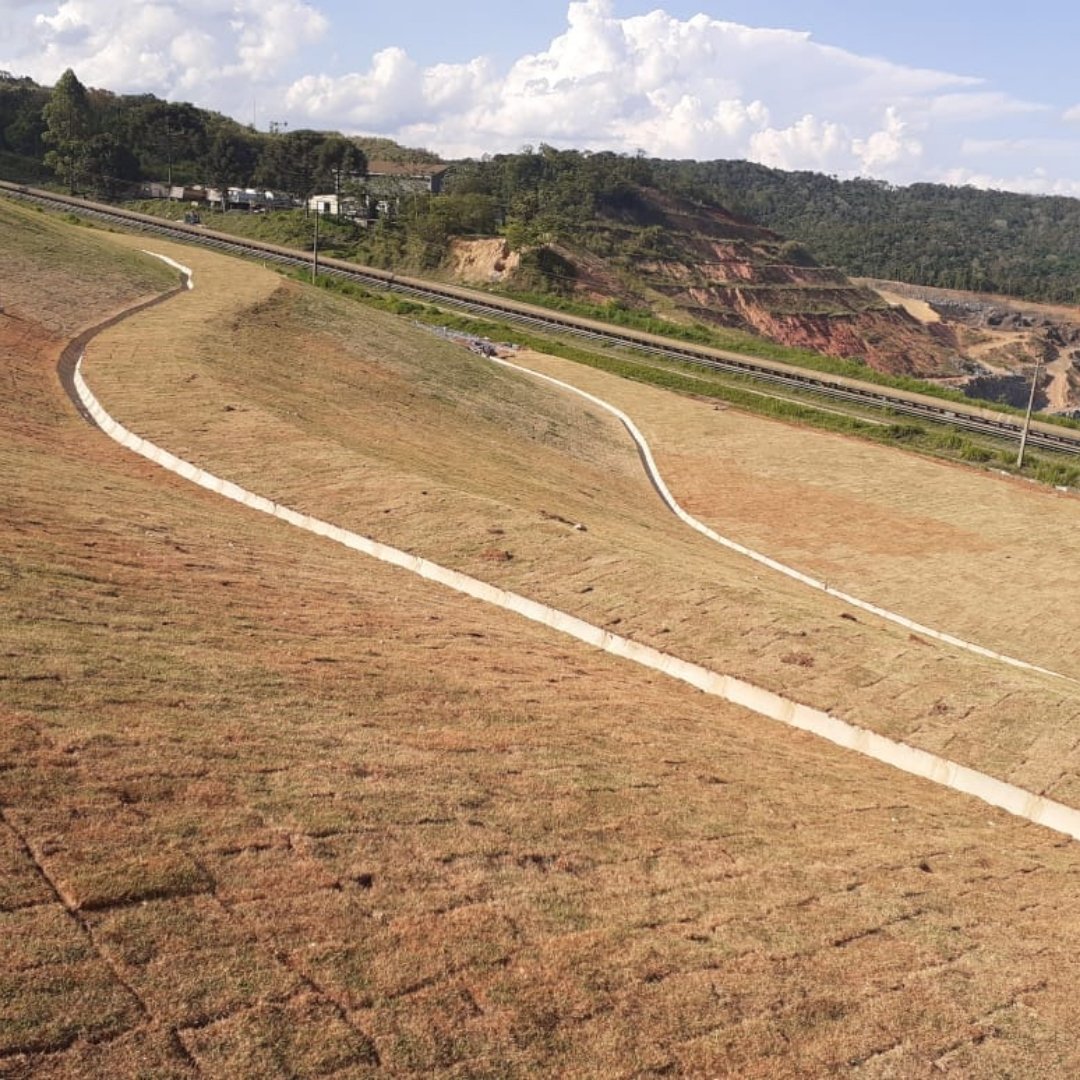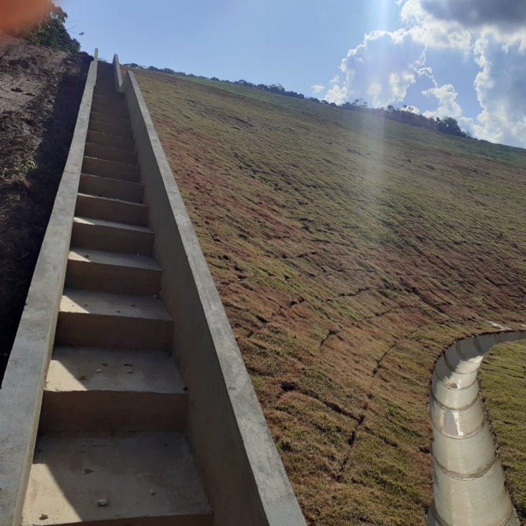 Escada Hidráulica e Canaleta de Drenagem | Cimentos Tupi. Execução de escada hidráulica em concreto armado associada à canaleta de drenagem superficial para controle e condução de águas pluviais em talude. Estrutura projetada para reduzir a velocidade do escoamento, minimizar processos erosivos e assegurar a estabilidade geotécnica da encosta com desempenho técnico adequado.