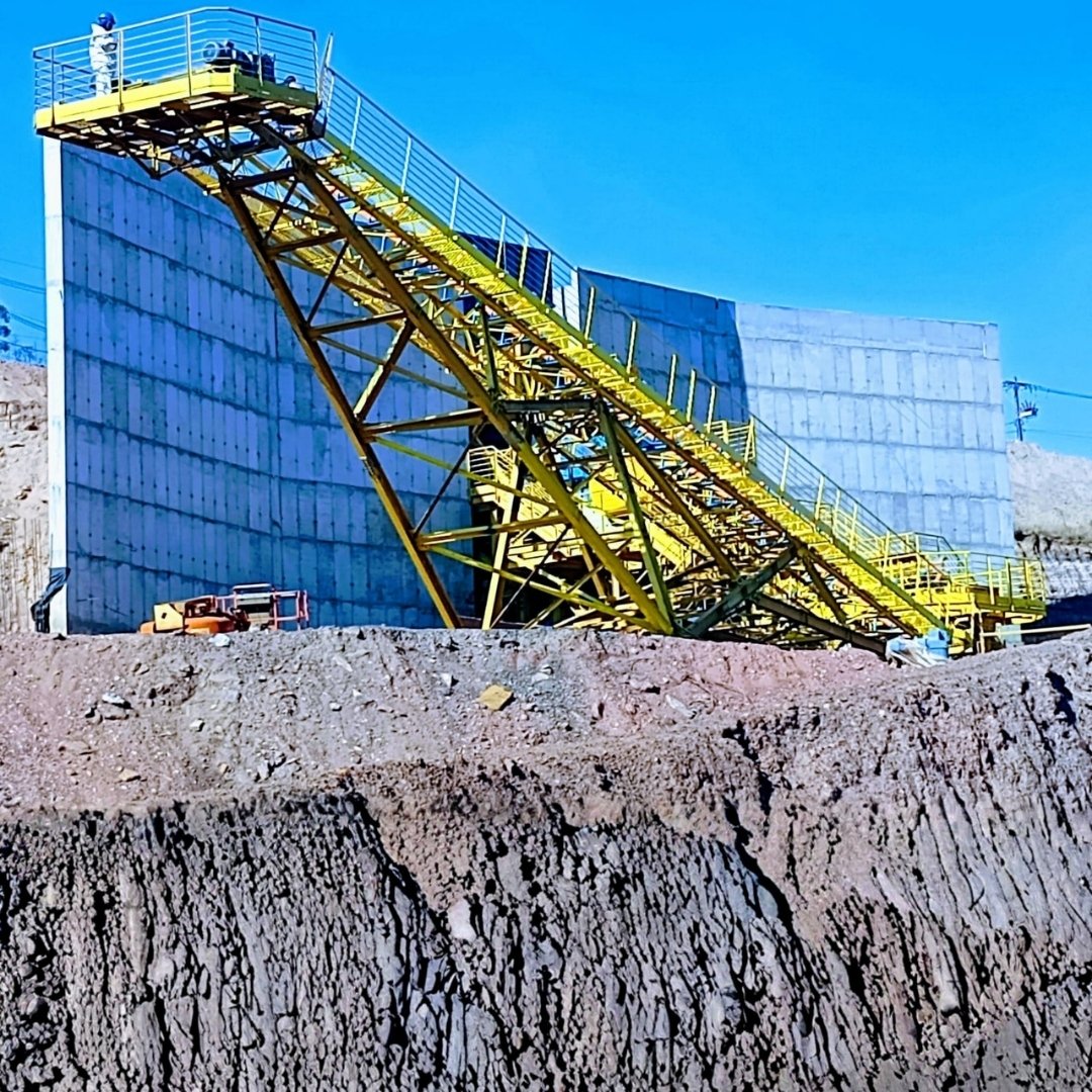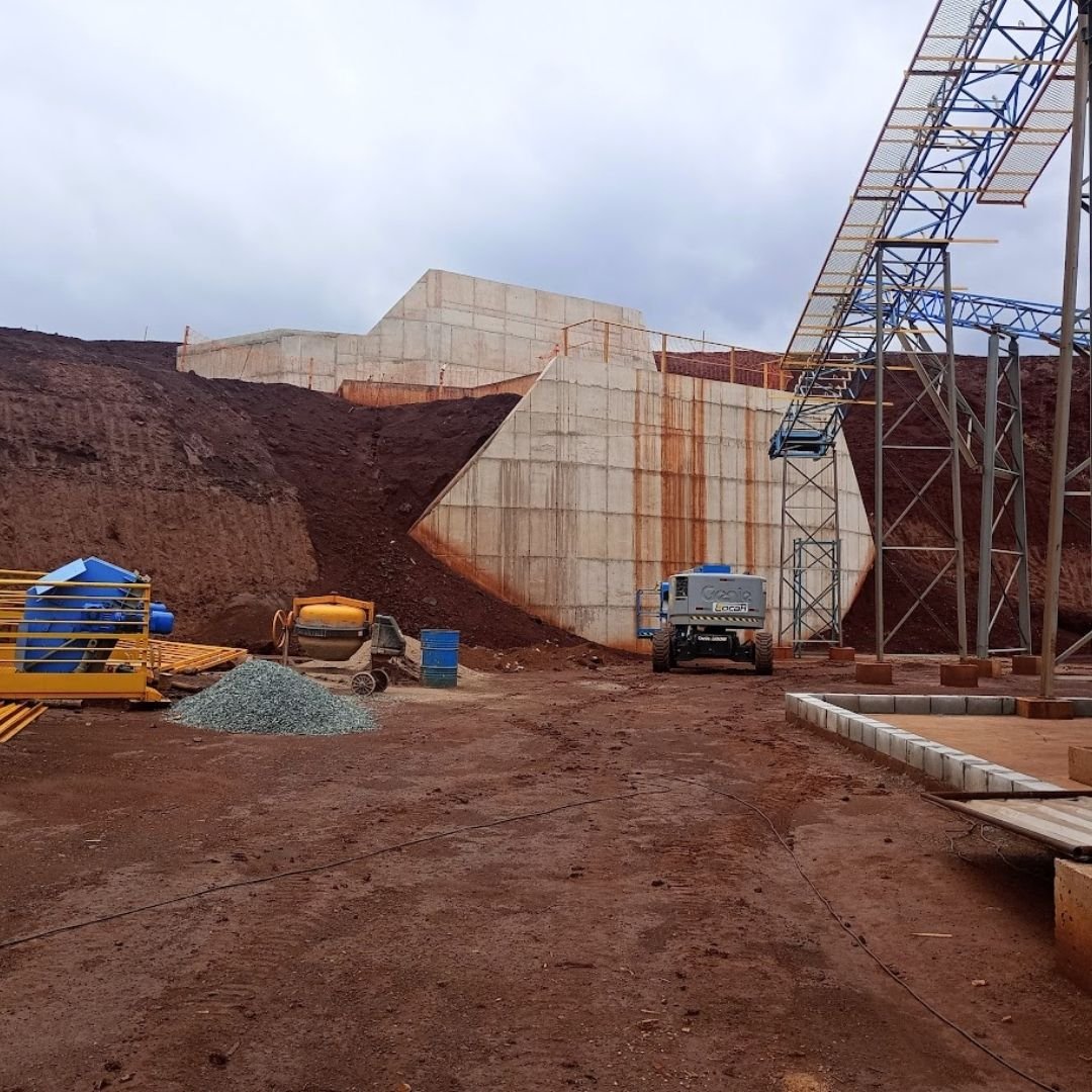 Execução de Muro de Contenção – Britagem Pivô Montante | Herculano Mineração. Execução de muro de contenção em concreto armado na área de britagem, setor pivô montante, destinado à contenção de material, estabilização estrutural e proteção operacional do conjunto de britagem, garantindo segurança, resistência e desempenho adequado às condições industriais.